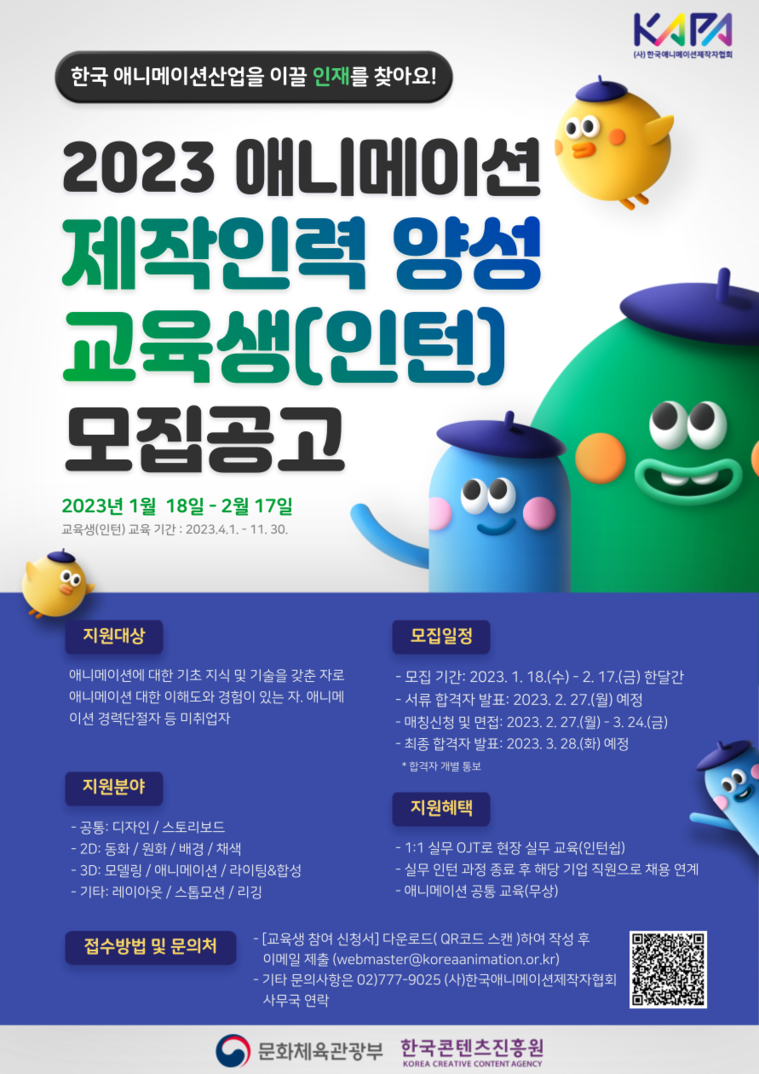 | » | 2023년 | 2D, 3D 애니메이션 제작 인력(인턴)공고 | (사)한국애니메이션제작자협회 | 2023.02.13 | 656 |