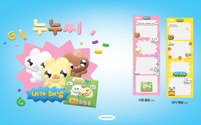 누누씨 특유의 밝고 재치 있는 그래픽이 들어간 이 프레임은 수험생들에게 격려의 메시지를 전하고 시험 이후의 순간을 특별하게 기록하게 하고자 마련했다. 누누씨 포토 프레임은 1월 31일까지 전국 포토이즘 기기에서 제공된다.