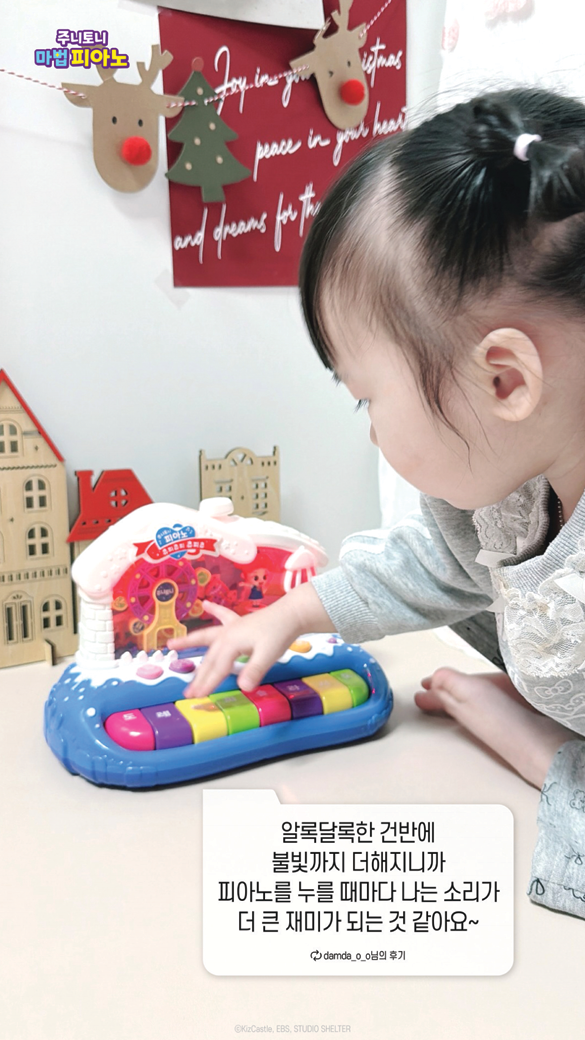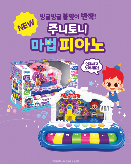주니토니 구구단 송 경찰차 스마트폰은 간단한 버튼 조작으로 구구단 송과 동요, 영어 숫자 등 다양한 사운드 콘텐츠를 즐길 수 있는 제품이다. 주니토니 마법 피아노는 건반 연주와 동요 감상을 동시에 즐기는 완구로 불빛과 캐릭터 움직임 요소를 더해 시각적·청각적 흥미를 강화했다. 자유 연주와 음악 콘텐츠 감상이 모두 가능하다.