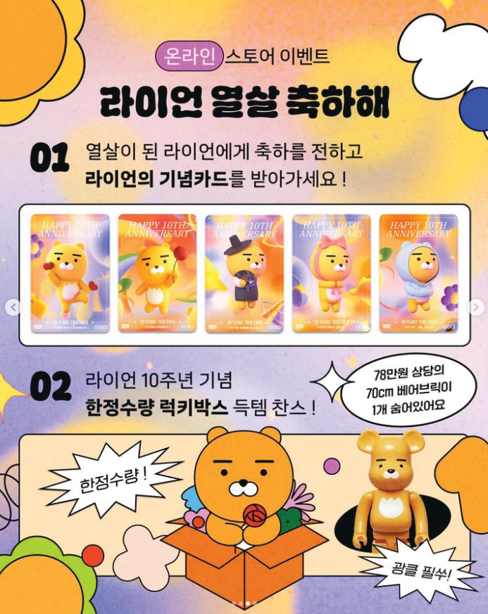 카카오는 라이언이 이용자들의 일상에서 함께해 온 시간을 돌아보는 동시에 앞으로도 변함없이 함께하겠다는 메시지를 담아 라이언 특별영상 공개, 10주년 에디션 상품 및 이모티콘 출시, 온라인 프렌즈샵 한정판 라이언 럭키박스 판매, 홍대 플래그십스토어 특별 공간 조성 및 이벤트 진행 등 다양한 10주년 기념 콘텐츠를 선보인다.