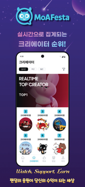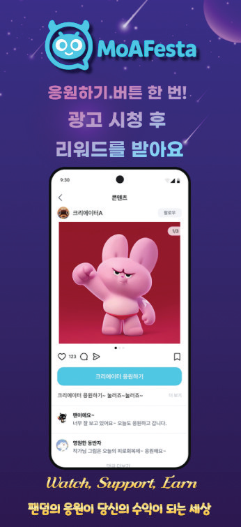 모아벤처스는 크리에이터와 팬덤을 연결하는 수익 공유 앱 ‘모아페스타’를 구글 플레이와 앱스토어에 출시했다고 밝혔다. 이 앱은 광고 시청에 기반한 후원 시스템이다. 팬이 특정 크리에이터의 ‘응원하기’버튼을 누르면 광고가 나오고, 이를 시청해 발생한 수익은 팬과 크리에이터에게 자동 배분된다.