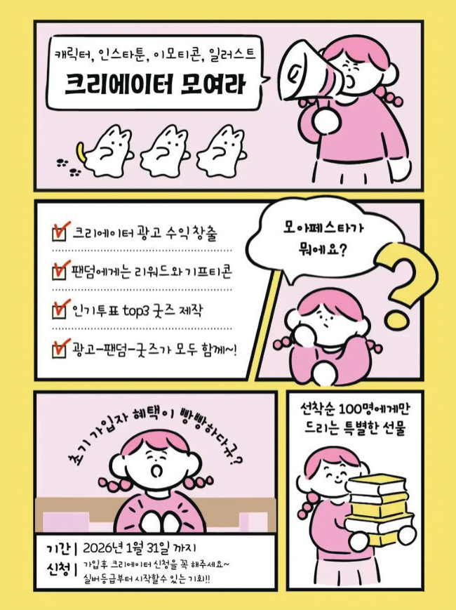 또 팝업, 전시, 굿즈 등의 이벤트를 알려 팬덤을 쌓고 월별, 시즌별 인기투표에서 상위권에 오르면 굿즈 제작 지원금, 오프라인 행사 및 콜라보레이션 참가 등의 추가 보상도 받을 수 있다.