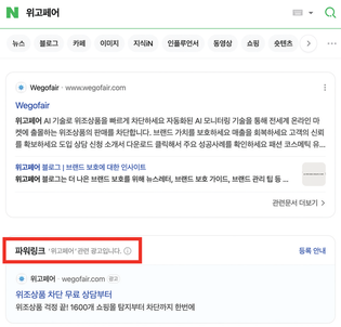 검색창에 위고페어를 넣으면 검색창 바로 밑에 위고페어 표장과 홈페이지 주소, 서비스에 대한 설명이 함께 나온다. 빨간색 상자를 보면 ‘위고페어 관련 광고입니다’라는 안내 문구가 나타나고 여러 웹사이트의 명칭과 주소가 나열된다. 각 인터넷 주소 하단에서는 관련 광고나 설명 문구를 볼 수 있다.