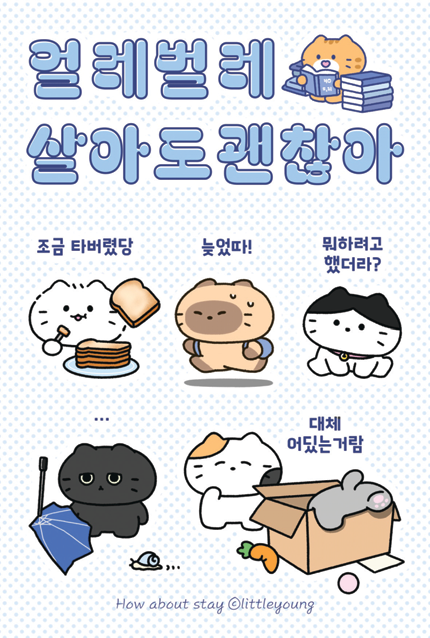 모두가 처음인 세상에서 완벽하지 않아도 가끔은 얼레벌레(얼렁뚱땅) 살아가도 괜찮다는 이야기를 전하고 싶어 캐릭터를 그리기 시작했다. 얼레벌레 냥이들은 우리 일상을 고양이에 빗대어 그린 기록과 같다. 이를 보면서 바쁜 하루를 보내는 많은 사람이 작은 위안을 얻길 바란다.