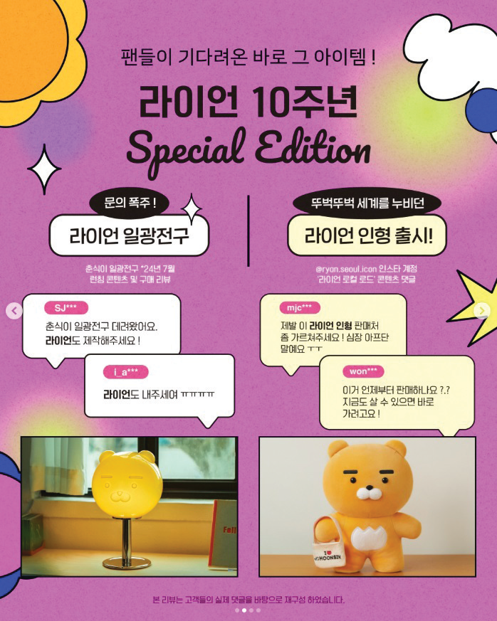 이후 라이언은 캐릭터 상품과 라이선스 사업으로 활동 영역을 꾸준히 확장해 왔다. 지금까지 선보인 라이언 굿즈 종류만 1만여 종, 협업한 브랜드는 500여 개가 넘는다. 지난 10년간 이모티콘, 콘텐츠, 굿즈, 브랜드 협업 등 다양한 영역을 넘나들며 강력한 팬덤을 구축한 것.