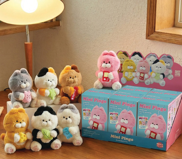 미니, 츄르, 치즈, 마우스, 물고기 핑고 캐릭터 인형 키링이 랜덤으로 든 제품.