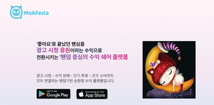모아벤처스는 크리에이터와 팬덤을 연결하는 수익 공유 앱 ‘모아페스타’를 구글 플레이와 앱스토어에 출시했다고 밝혔다. 이 앱은 광고 시청에 기반한 후원 시스템이다. 팬이 특정 크리에이터의 ‘응원하기’버튼을 누르면 광고가 나오고, 이를 시청해 발생한 수익은 팬과 크리에이터에게 자동 배분된다.