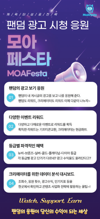 모아벤처스는 “모아페스타는 팬과 크리에이터가 광고 시청 리워드를 공유하며 즐거움과 수익을 함께 창출하는 차세대 팬덤 플랫폼”이라며 “크리에이터를 응원하는 팬들의 많은 관심과 참여 바란다”고 전했다.