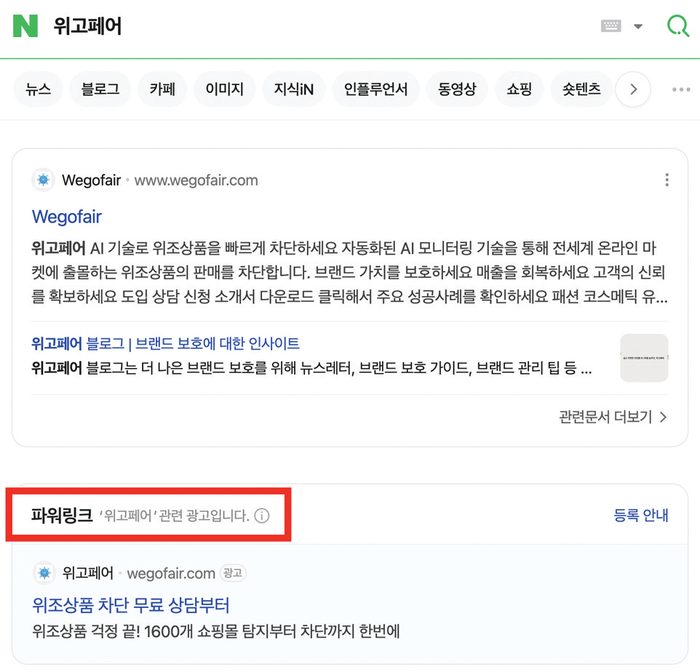 검색창에 위고페어를 넣으면 검색창 바로 밑에 위고페어 표장과 홈페이지 주소, 서비스에 대한 설명이 함께 나온다. 빨간색 상자를 보면 ‘위고페어 관련 광고입니다’라는 안내 문구가 나타나고 여러 웹사이트의 명칭과 주소가 나열된다. 각 인터넷 주소 하단에서는 관련 광고나 설명 문구를 볼 수 있다.