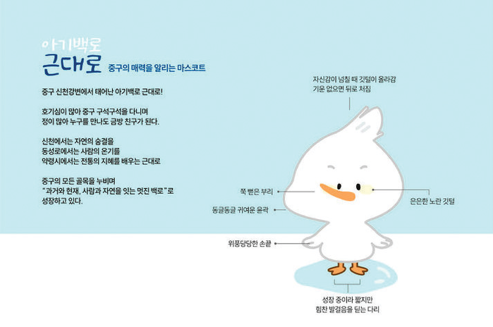 대구 중구청이 대표 캐릭터 아기백로 근대로를 공개했다. 아기백로 근대로는 도심 속 자연과 전통, 사람의 온기를 잇는 이야기 여행가를 테마로 한 캐릭터다. 백로가 서식하는 신천강 변의 자연환경. 근대 골목의 역사 문화, 약령시의 전통, 동성로의 활력을 상징한다. 중구청은 저작권 및 상표권 등록을 마치고 각 부서의 홍보물과 안내자료에 활용할 예정이다.