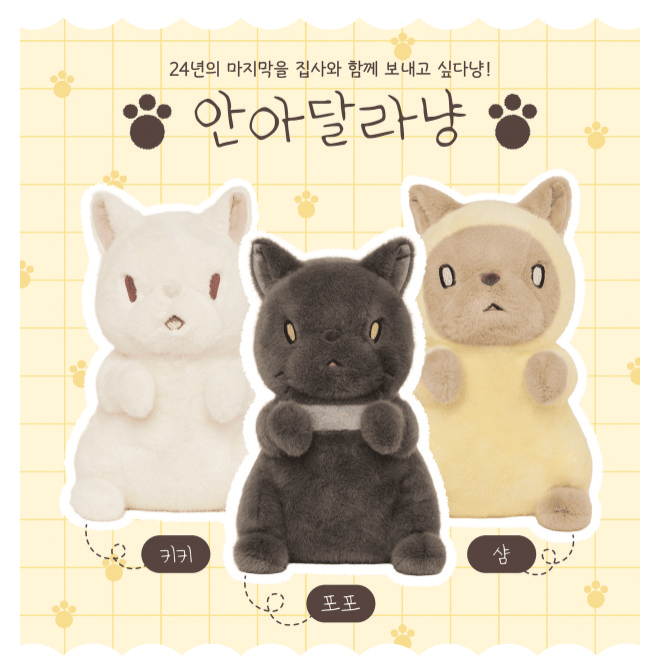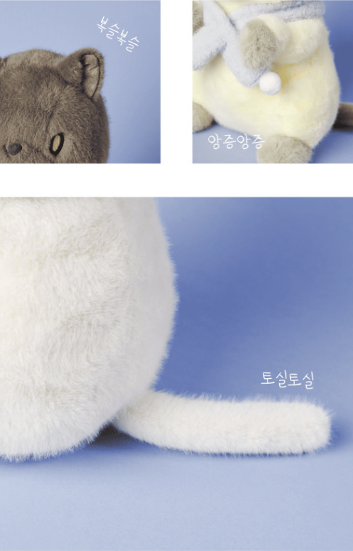 이번에 나온 인형은 터키시 앙고라 고양이 키키, 스모크 페르시안 고양이 포포, 샴 고양이 샴 3종으로 1.5리터 페트병만 한 크기(28cm)여서 품에 쏙 들어온다.