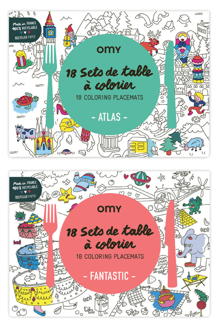 테이블을 장식하고 식사 중인 아이들의 시선을 끄는 6가지 디자인의 컬러링 플레이스매트.