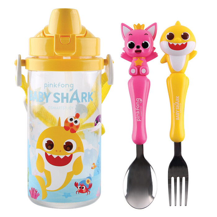 핑크퐁과 아기상어 피규어가 달린 스푼, 포크와 어깨끈이 탈착되는 물병이 들어 있는 제품.