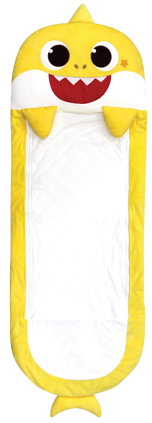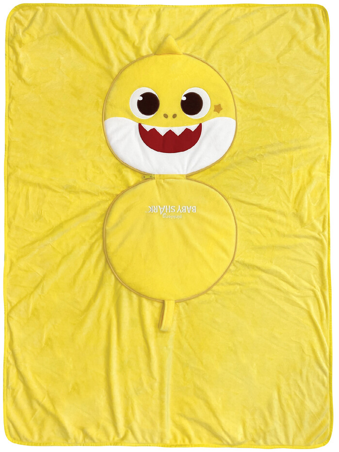 핑크퐁 원더스타와 핑크퐁 아기상어가 입혀진 침낭으로 낮잠이불로도 사용 가능한 제품.