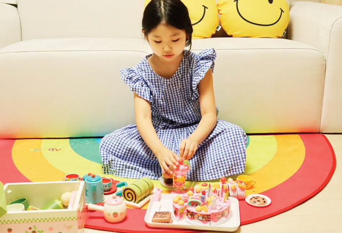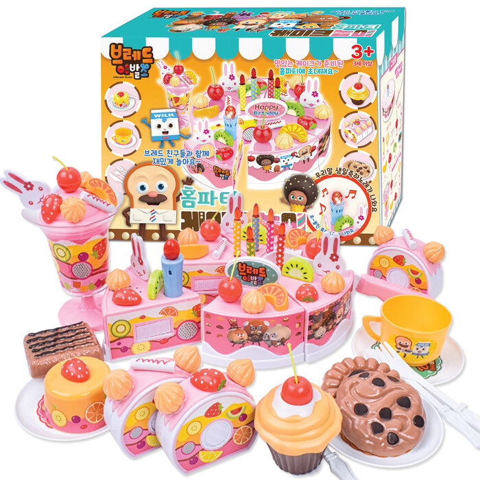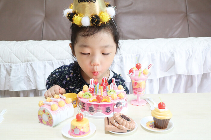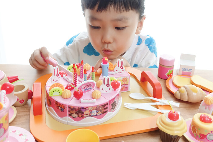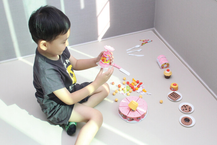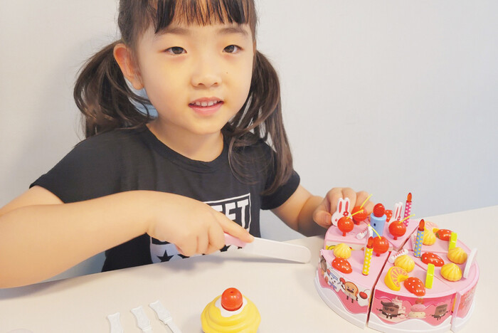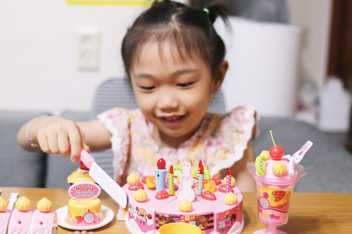 아이가 촛불을 끄고 케이크를 자르거나 디저트 음식을 접시에 나눠 담는 소꿉놀이에 푹 빠졌어요. 여러 토핑 모형으로 케이크를 예쁘게 꾸미는 재미가 쏠쏠해요.