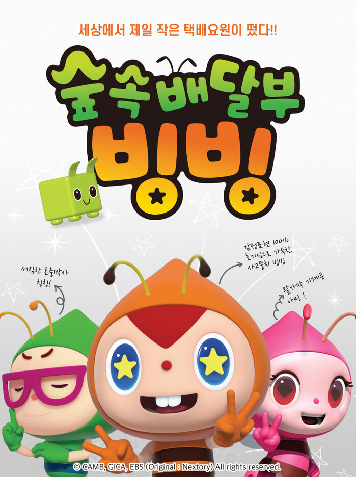 문화콘텐츠 전문기업 캠비가 애니메이션 구름빵으로 유명한 강원정보문화진흥원 , EBS와 함께 만든 애니메이션 숲속 배달부 빙빙이 EBS에서 방영을 시작했다. 11분 분량의 에피소드 26편으로 구성된 이 작품은 평화로운 숲속의 꿀벌 택배 3총사 빙빙 , 아밍 , 칭칭이 펼치는 우정과 모험 이야기를 통해 꿈과 희망을 배달하는 택배란 직업이 얼마나 보람 있고 가치가 있는지 보여주며 어린이들이 사회성을 기를 수 있도록 돕는다. 에피소드마다 숨기대장 대벌레 , 힘센 물장군 , 먹보 애벌레 , 똥 경단 스승 소똥구리 등 숲속에 살고 있는 개성 있는 곤충들과 함께 애벌레 카고트럭 , 메뚜기 자동차 등 곤충 모양의 다양한 탈것이 등장해 어린이들의 호기심을 자극하고 즐거움을 선사한다. 또한 에피소드 후반에는 곤충생태 전문가의 자문을 얻어 제작된 EBS 곤충 다큐멘터리 영상이 삽입돼 우리나라 곤충 생태에 대한 올바른 정보를 제공한다. 캠비는 강원정보문화진흥원 , 춘천애니메이션박물관과 함께 부가상품 개발 및 라이선싱 사업을 활발히 진행하고 한솔수북과 함께 숲속 배달부 빙빙 그림책을 출간하는 등 다채로운 마케팅 활동을 전개할 계획이다. 숲속 배달부 빙빙은 매주 월 , 화요일 오전 7시 45분에 방송되며 일요일 오전 10시에는 두 편이 연달아 방송된다.