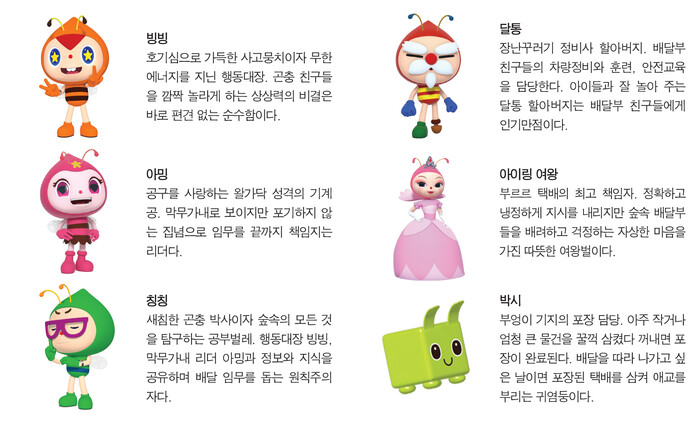 꿀벌들의 회사 부르르 택배에는 신기한 시설들과 재미있는 탈것으로 가득하다. 하지만 그중에서 제일 멋진 건 택배 상자를 들고 곤충들의 집을 찾아가는 배달부 3총사 빙빙과 아밍 , 칭칭. 어렵거나 위험한 일앞에서도 힘을 합쳐 임무를 완수하고 개성만점의 곤충들과 친구가 되는 숲속 배달부들에게 오늘은 또 어떤 일들이 펼쳐질까? 꿀벌 배달부 삼총사의 기상천 외한 택배 배달 이야기에 빠져보자.