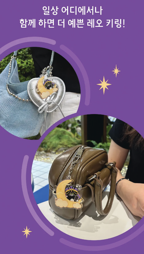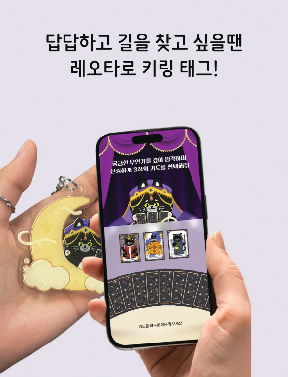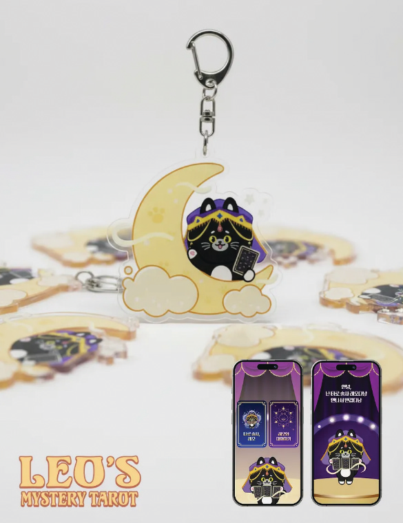 AI 타로 키링 ‘레오 타로’는 달빛을 모티브로 한 신비로운 디자인에 타로의 전통적 매력과 별자리 감성을 결합했다.