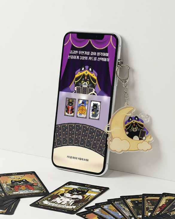 사용자는 NFC 태깅을 통해 매일 나만의 타로 카드를 뽑아 운세를 확인할 수 있으며 AI가 개인화된 해석과 조언을 제공한다. RAG(Retrieval-Augmented Generation) 기술과 sLLM(경량 대형 언어 모델)을 활용해 정확하고 몰입감 있는 응답을 생성하며 이미지 생성 기능으로 타로 카드