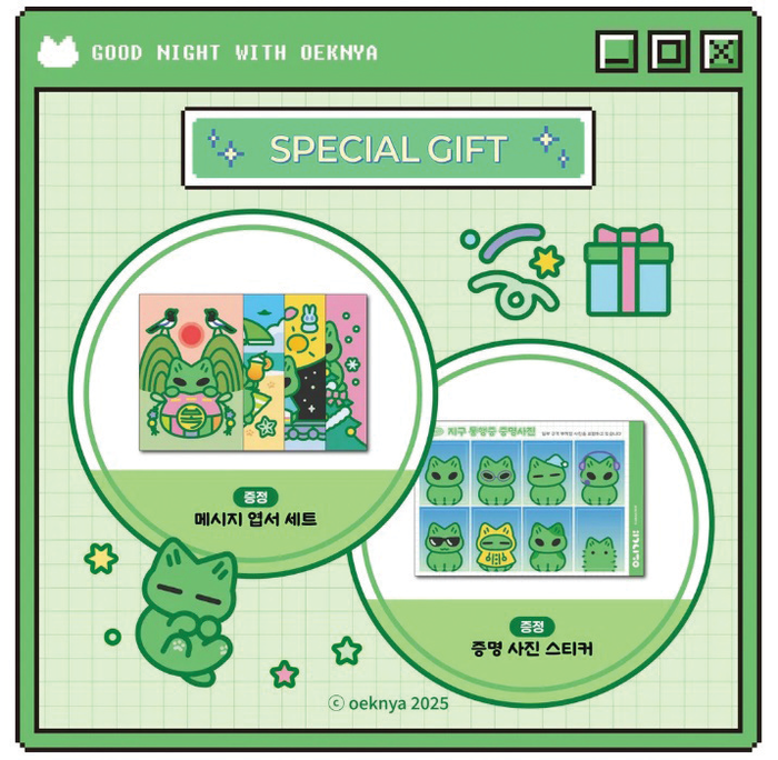 대원씨아이 굿즈연구소는 특전으로 왹냐가 전하는 따뜻한 메시지가 적힌 엽서 세트와 왹냐의 다양한 모습을 담은 증명사진 스티커를 준비했으며 펀딩 달성률에 따라 투명 포토 카드, 미니 포스터를 증정했다.