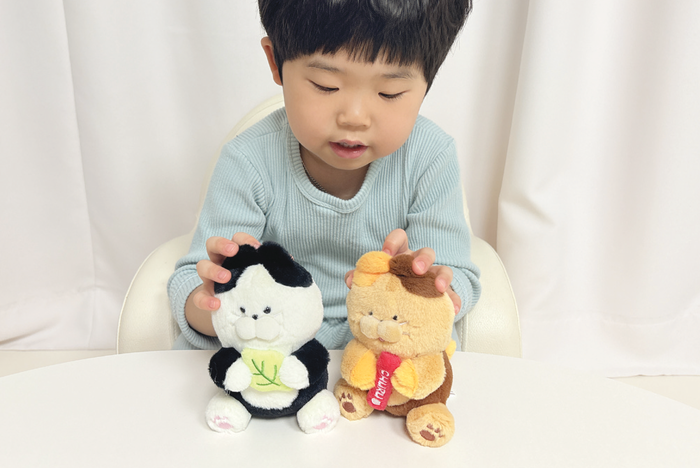 인형 소재가 생각보다 부드럽고 폭신해서 느낌이 좋아요. 얼굴도 오동통하고 귀여워서 자꾸 눈길이 가요. 인형마다 다른 아이템을 들고 있어요.