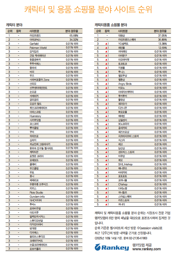 캐릭터 및 캐릭터용품 쇼핑몰 분야 순위는 시장조사 전문 기업 랭키닷컴이 6만 명의 패널을 대상으로 표본조사하여 집계한 것입니다. 순위 기준은 웹사이트의 세션 방문 수(session visits)로 최근 12주간의 방문 내역을 근거로 산정됩니다.(2025년 10월 14일 기준)