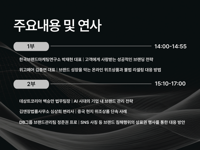 이번 세미나에는 브랜딩, 기업 법무, 지식재산, AI 기반 브랜드 보호 분야의 주요 전문가들이 연사로 나서 브랜드 마케팅 전략, AI 기반 위조 상품·비공식 유통 대응, 기업 내 브랜드 관리 전략, 중국 현지 위조 상품 단속 사례, SNS 사칭 등 온라인 브랜드 침해 대응 방안 등을 소개한다.