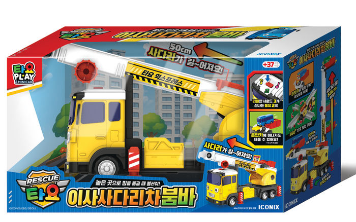 레스큐 타요 이사 사다리차 붐바는 레버를 돌리면 사다리가 최대 50cm까지 올라가며 360도 회전하는 기능이 있어 이삿짐이나 미니카를 옮기는 놀이를 즐길 수 있고 각종 사운드와 동요도 흘러나온다.