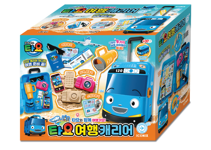 물놀이, 모래놀이, 스탬프 놀이 등 9가지 여행 아이템이 들어 있는 타요 여행 캐리어는 스티커, 여권 도장 등을 활용해 여행 놀이를 즐겨보는 제품이다.