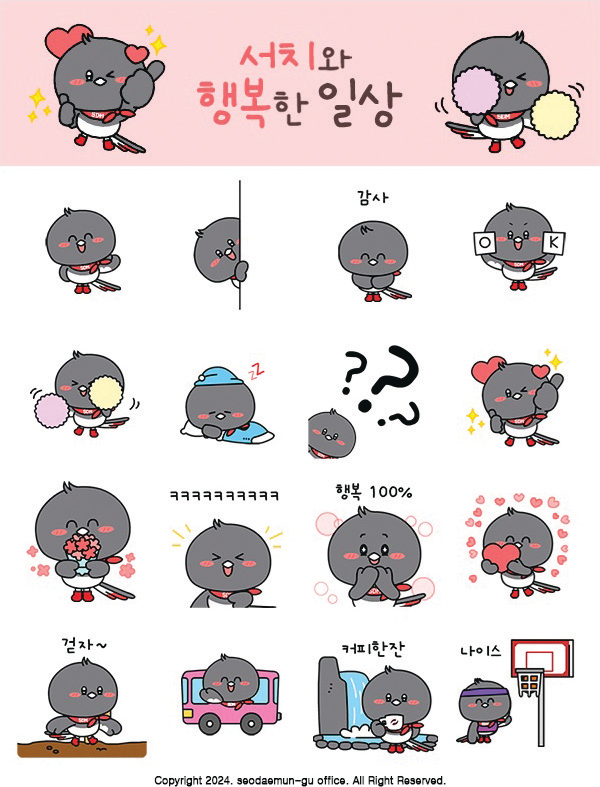 서치는 서울 서대문구를 상징하는 새인 까치를 모티브로 탄생한 캐릭터다. ‘서대문구 까치’를 줄인 약어에는 ‘서대문구 곳곳을 날아다니며 행복을 찾는다(search)’는 의미가 담겨 있다.