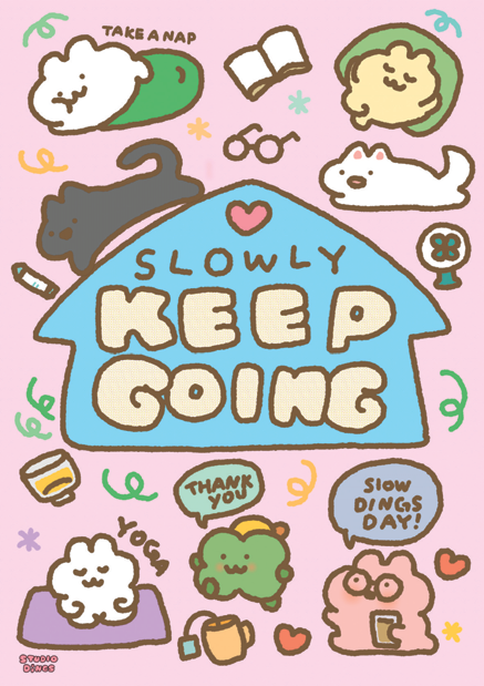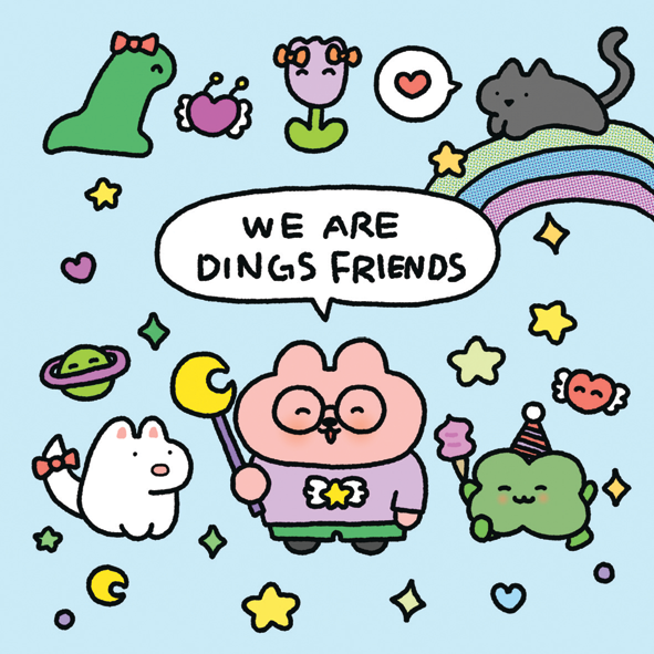 딩스프렌즈는 나만의 속도를 응원하는 캐릭터 브랜드다. 귀가 짧고 안경을 쓴 분홍 토끼 딩스, 하얀 진돗개 도지니, 네잎클로버 모양의 선인장 로로를 중심으로 지친 어른이의 일상을 위로한다. 나만의 속도로 천천히 나아가는 우리를 응원하며 ‘Slowly keep going, just be myself’의 메시지를 전한다.