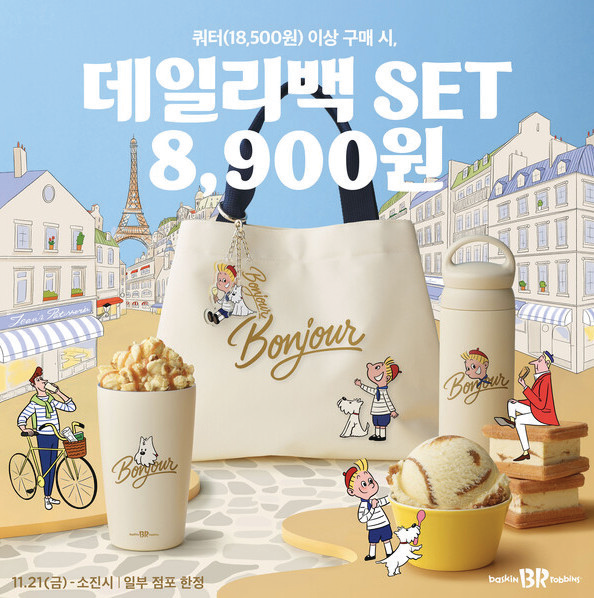 데일리백 세트는 데일리백, 스티커팩, 아크릴 키링 등 3종으로 구성됐다. 배스킨라빈스가 선정하는 11월 이달의 맛 ‘골든 프랄린 버터’콘셉트에 맞춰 프랑스 감성을 담았다.