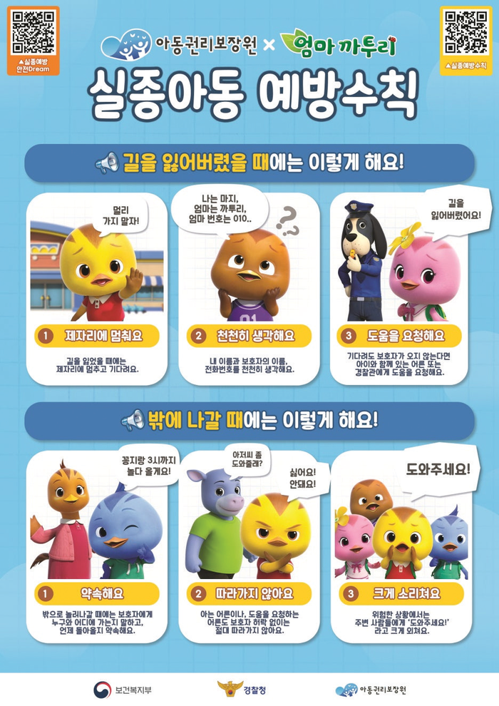 아동권리보장원은 엄마까투리 캐릭터 이미지와 포스터를 활용해 실종아동 예방에 관한 메시지를 친근하게 전하고 안전 의식도 높여 나갈 예정이다.