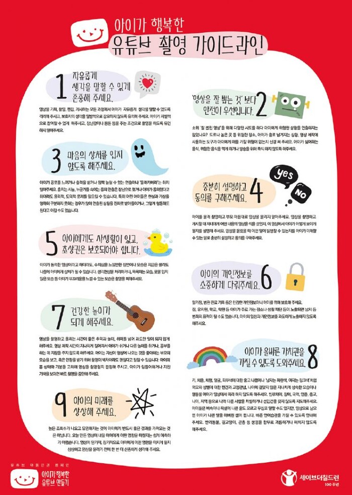 자유롭게 생각을 말할 수 있게 존중해주세요, ‘영상을 잘 뽑는 것’보다 안전이 우선입니다, 마음의 상처를 입지 않도록 해주세요, 충분히 설명하고 동의를 구해주세요, 아이에게도 사생활이 있고 초상권은 보호돼야 합니다, 아이의 개인정보를 소중하게 다뤄주세요, 건강한 놀이가 되게 해주세요, 아이가 올바른 가치관을 가질 수 있도록 도와주세요, 아이의 미래를 상상해 주세요 등의 내용을 담고 있다.